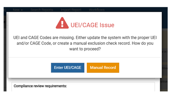 - A pop-up window will appear, allowing you to either enter the UEI/CAGE code or create a manual record of your SAM.gov check (see image below) .
